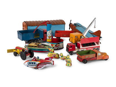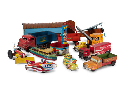 comprising a Courtland Mfg. Co. crane truck with box, a tractor, a Rocket Racer with box, a speed boat, a Fatiaowanju mother and baby duck wind-up toy with original box, a water well, two dump trucks, a trailer, an airplane in a covered garage; together with a plastic Coca-Cola semi truck; 11 items total.