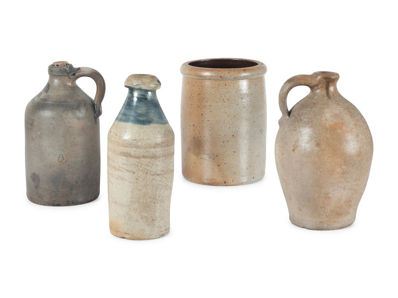 one jug with incised mark Charlestown, one incised Laubenhelmer & Koon and crock stenciled JAS, Benjamin / Wholesale / Stoneware / Depot. / Cincinnati, O.