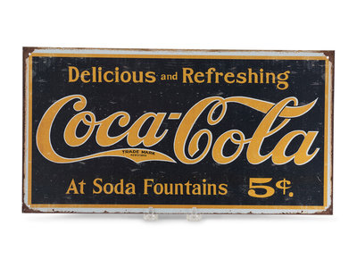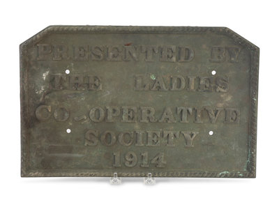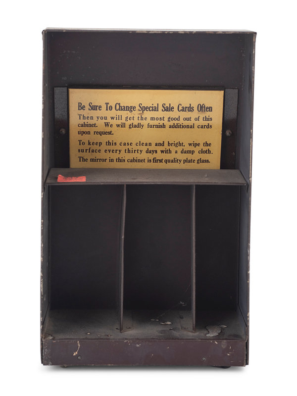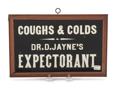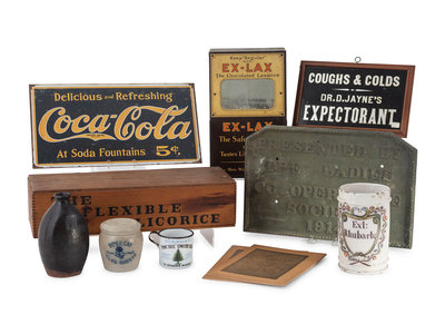 includes three plaques for Coca-Cola, Dr. D. Jayne's Expectorant and Ladies Co-Operative Society (1914), two booklets for The Home Formulary, advertising items for Flexible Licorice, Dickinson's Seeds, Ex-Lax, Nosegay Cheese, an apothecary jar and a flask.