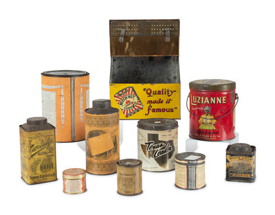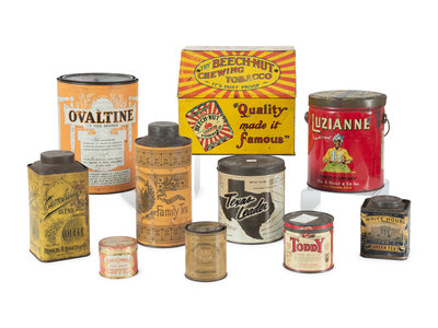 includes tins for Beech-Nut Chewing Tobacco, Philip Morris & Co. Cigarettes, Toddy, White House Green Tea, Cambridge Coffee, Luzianne Coffee, Choice Family Tea, Chase & Sanborn's Coffee, Texas Leader Coffee and Ovaltine.