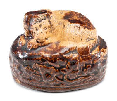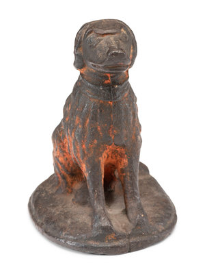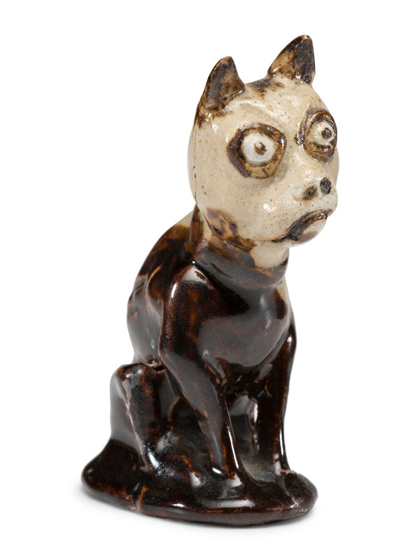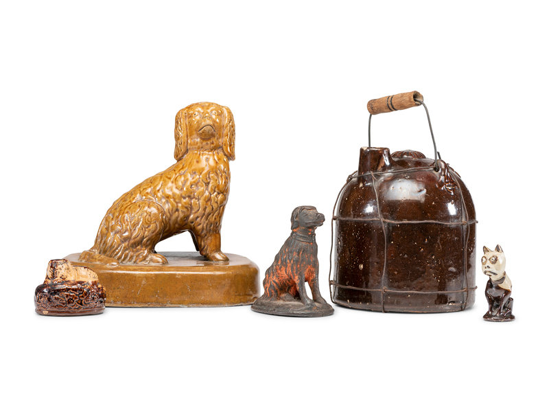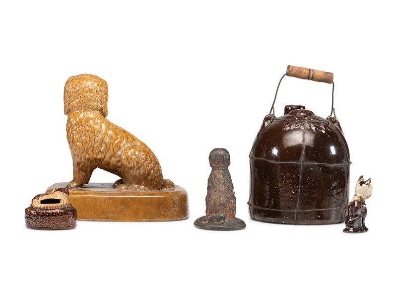 including a Liverpool stoneware dog, a yellowware dog bank, a cast iron painted dog paperweight, and a small dog figure, together with an Albany-glaze wire-wrapped jug.
