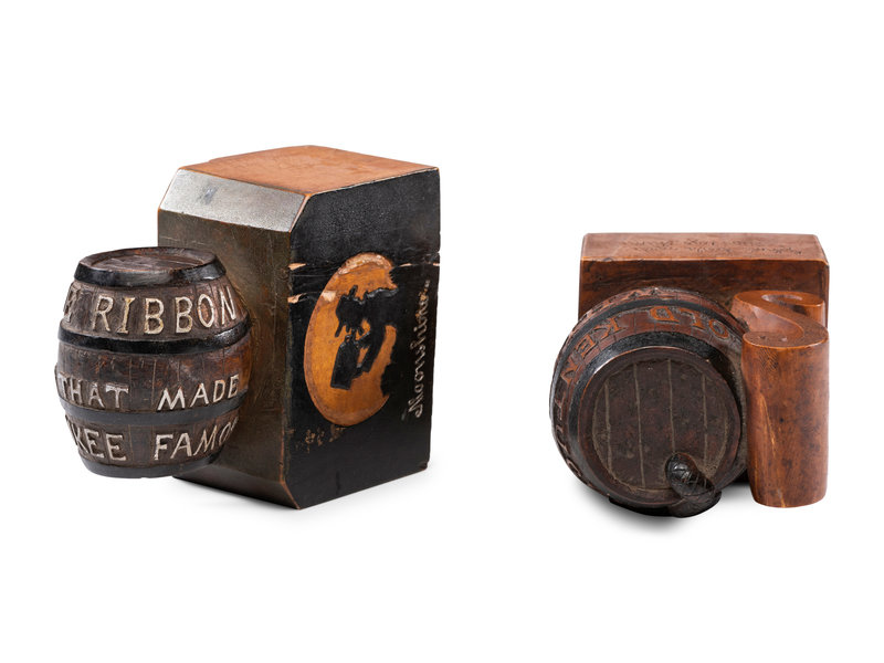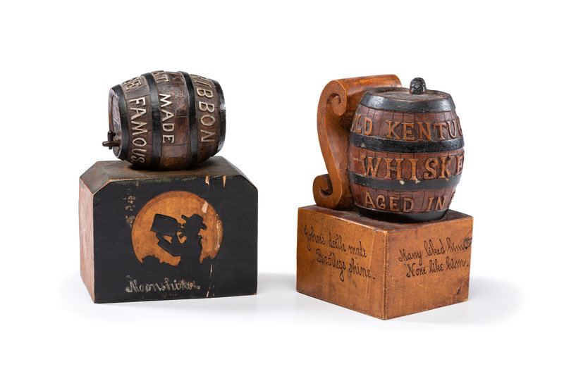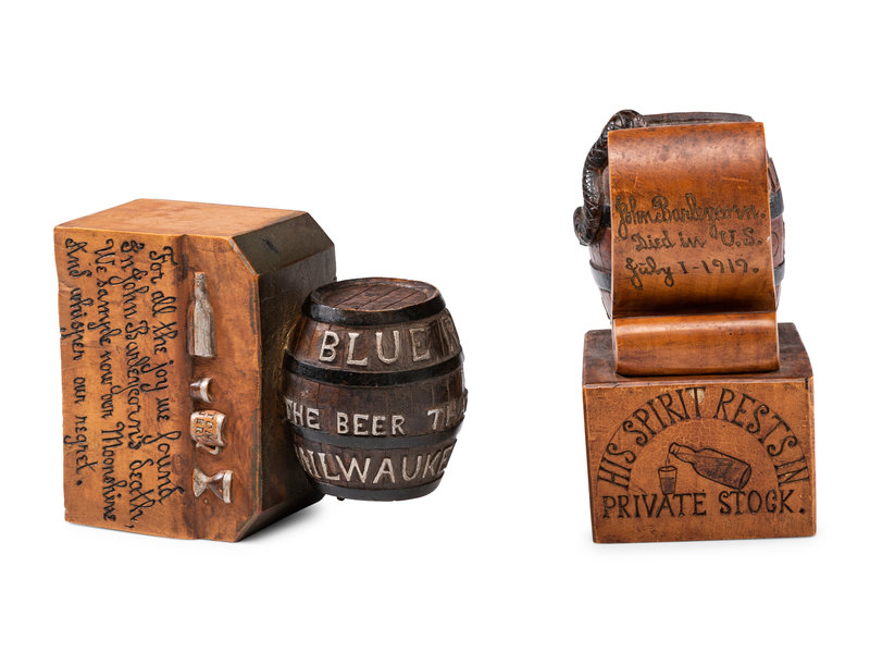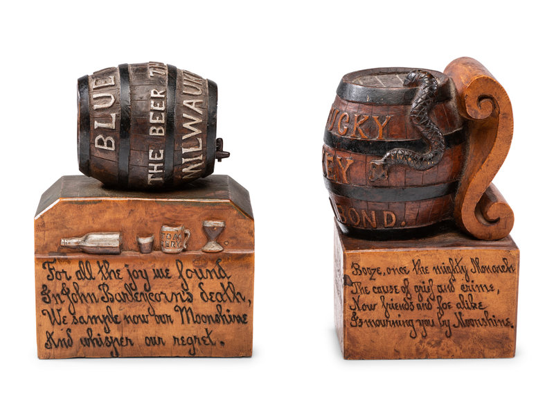 the other a Milwaukee beer barrel with poem reading For all the joy we found / In John Barleycorn's death / We sample now our Moonshine / And whisper our regret.