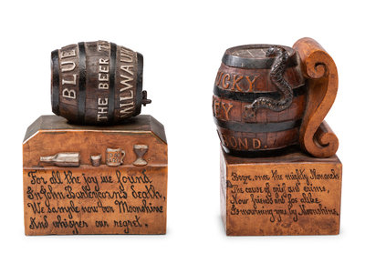 Two Prohibition Era 'John Barleycorn' Folk Art Carved Whiskey Barrels