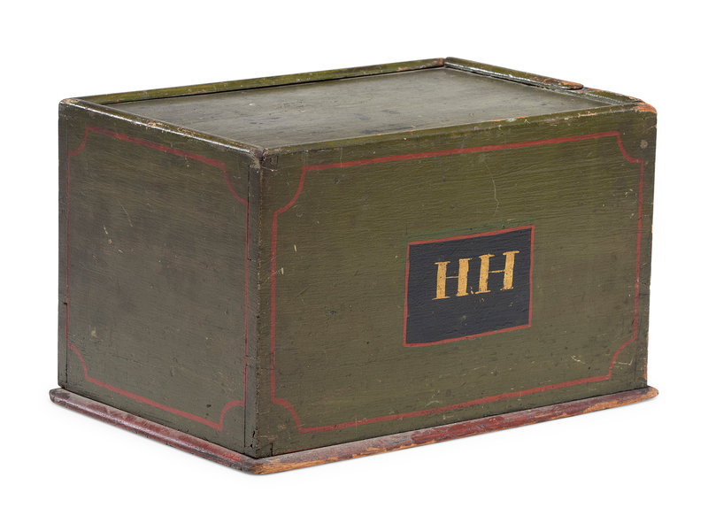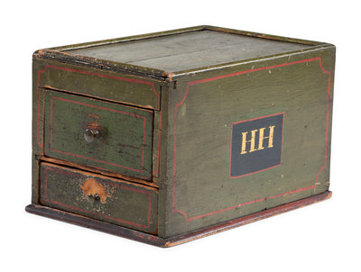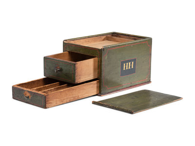 with slide lid, two drawers and initials HH on two sides.