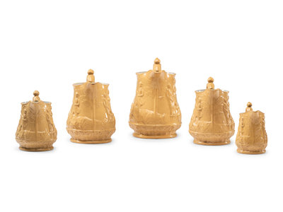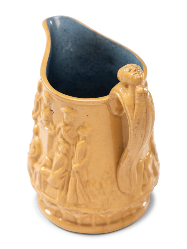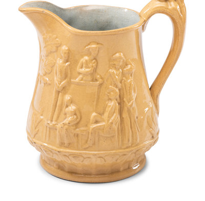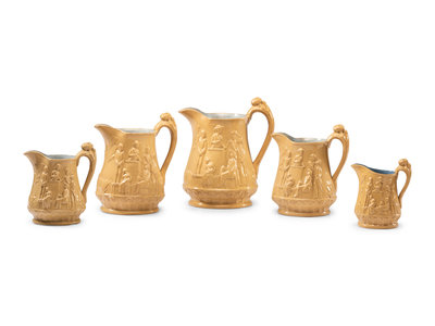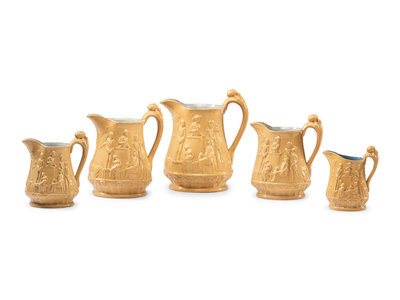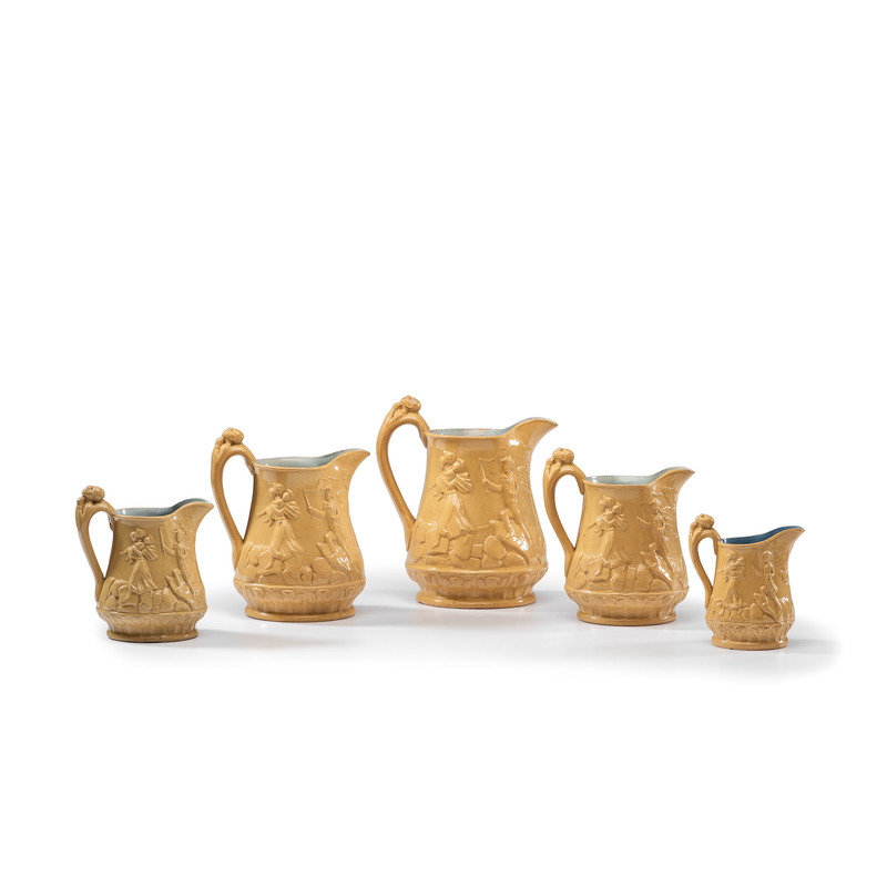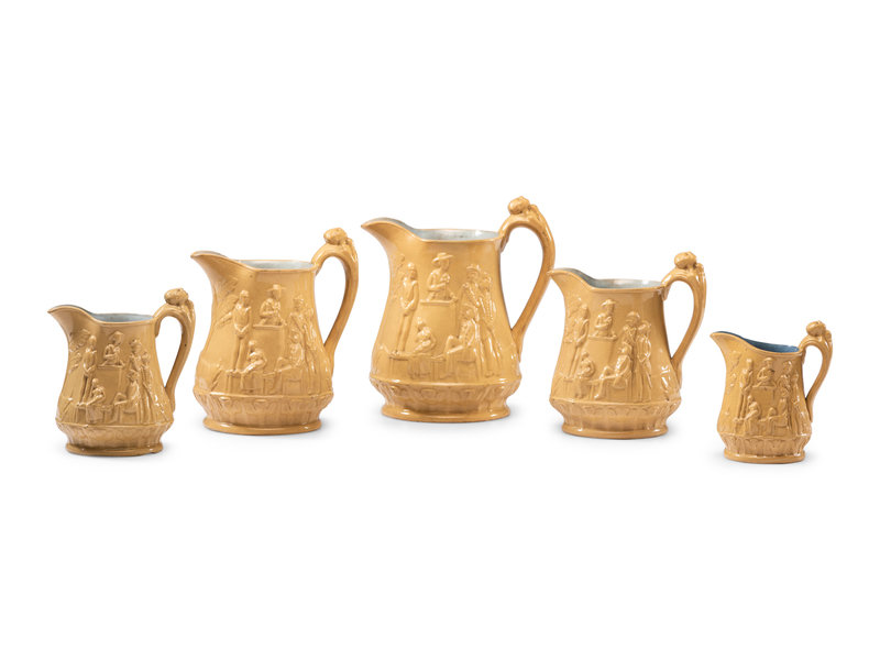 Five Graduated Abolitionist Yellowware Pitchers with Molded Scenes from Uncle Tom's Cabin