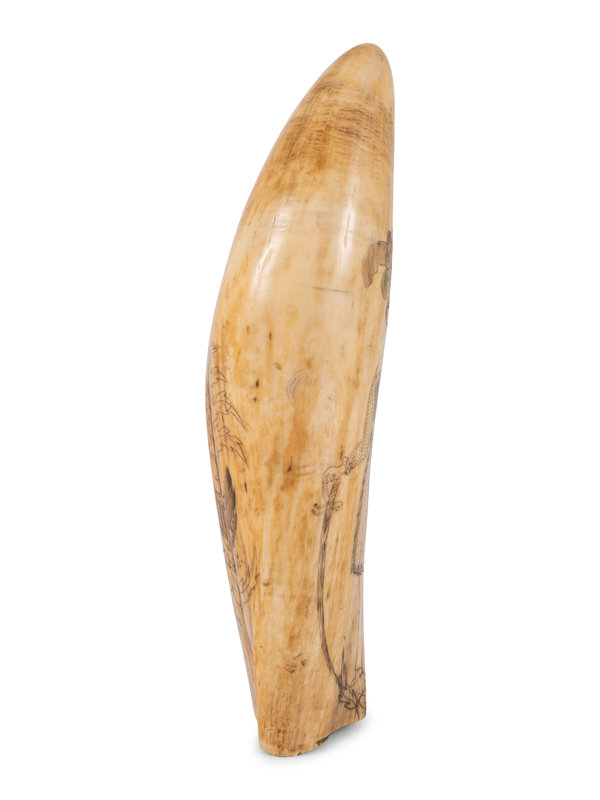 Due to the similarities between the patriotic devices and the acanthus leaves, one could reasonably assume that this tooth was decorated by the same hand as the Two Ships Underway tooth (Lot 35). Furthermore, the matching size, shape and morphology would indicate that the teeth are from the same whale.