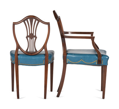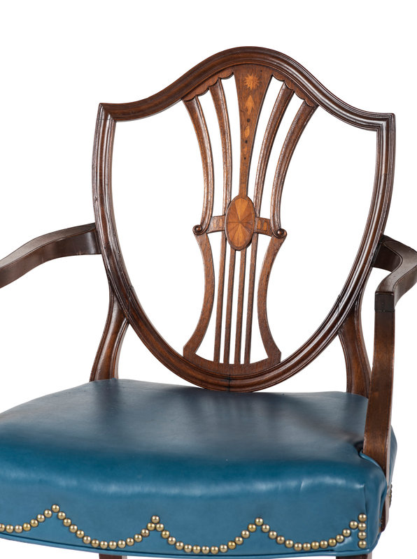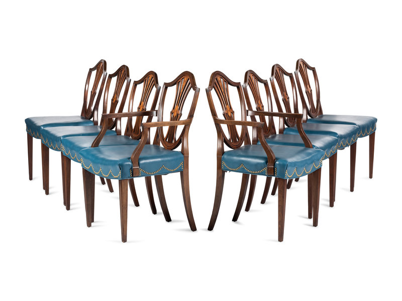 A Set of Eight Federal Style Inlaid and Volute-Carved Mahogany Shield-Back Dining Chairs