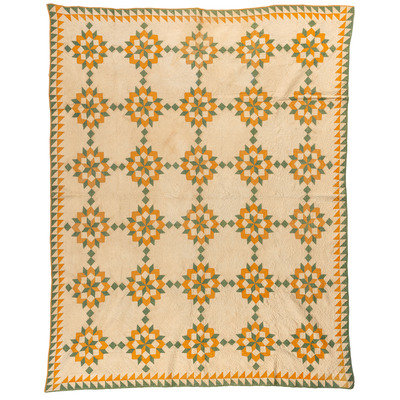 An Octagonal Star Pattern Quilt in Green and Gold