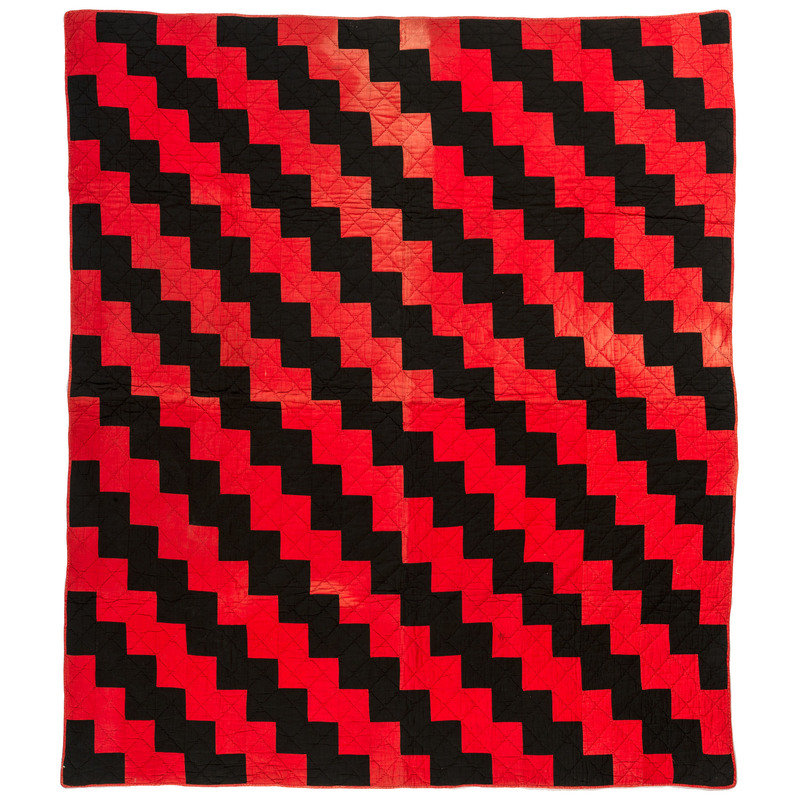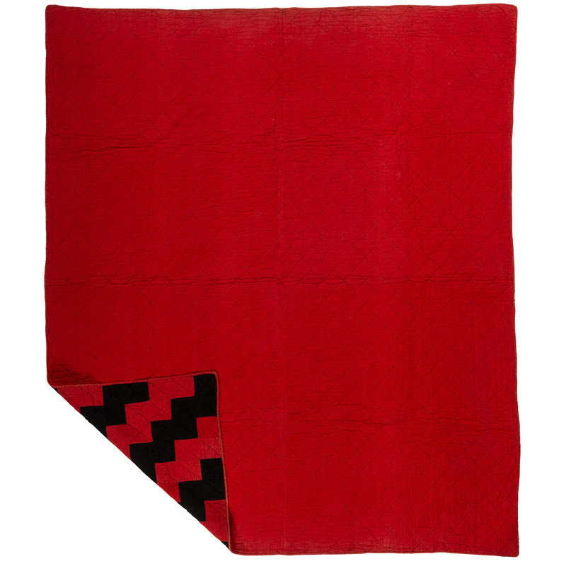 A Red and Black Pieced Zig Zag Pattern Quilt