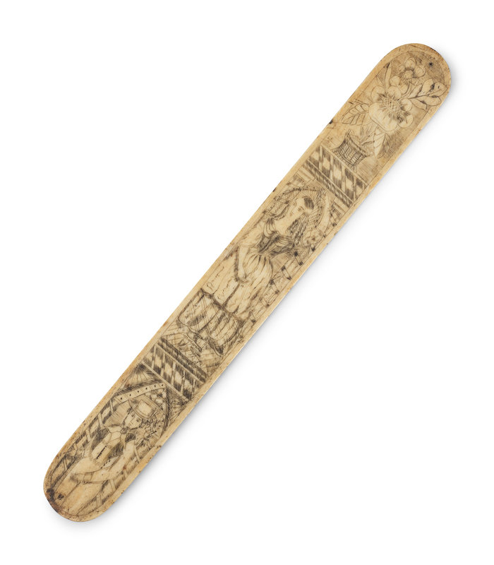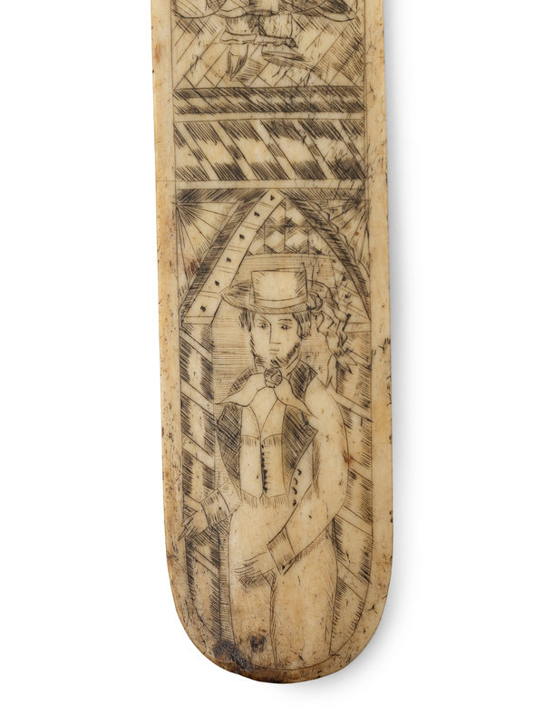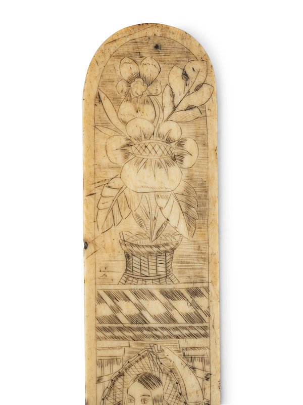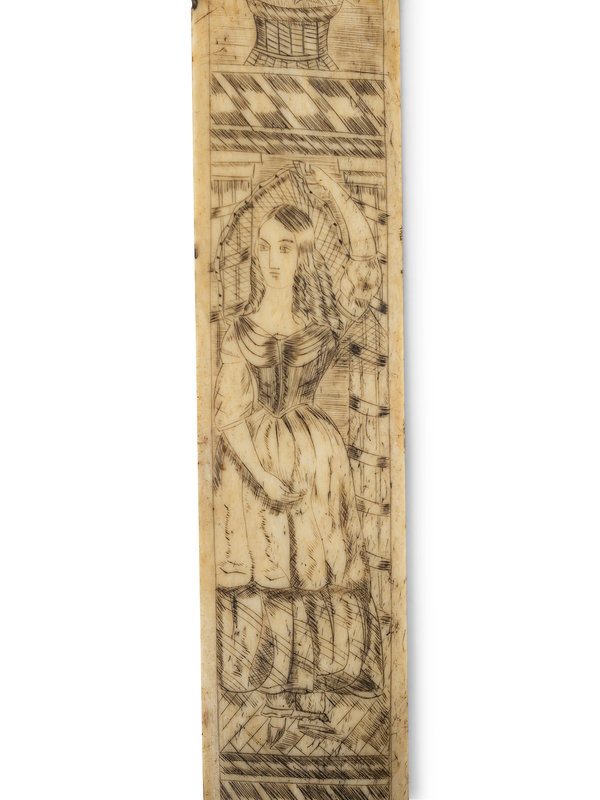 cut from sperm whale panbone, illustrating a flowering plant, a female figure with ringlets flanked by spiral-pattern pillars, and surmounted with geometric devices and a male figure in sailor's clothing flanked by spiral-pattern pillars, surmounted by a gothic arch and geometric devices.