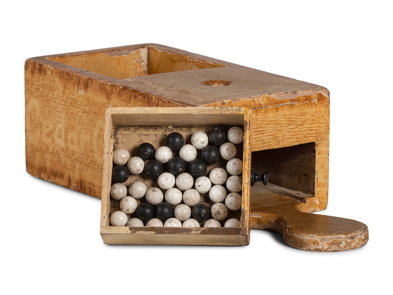 labeled Cedar Council on one side and White Elect / Black Reject to front, with group of black and white voting beads.