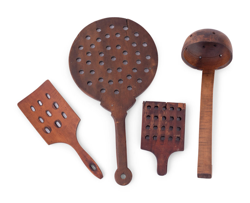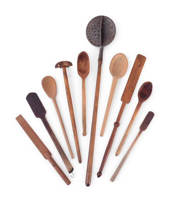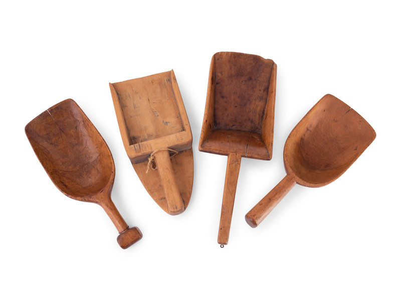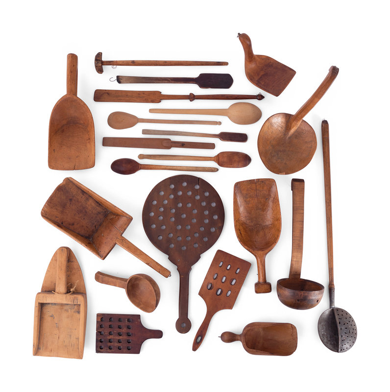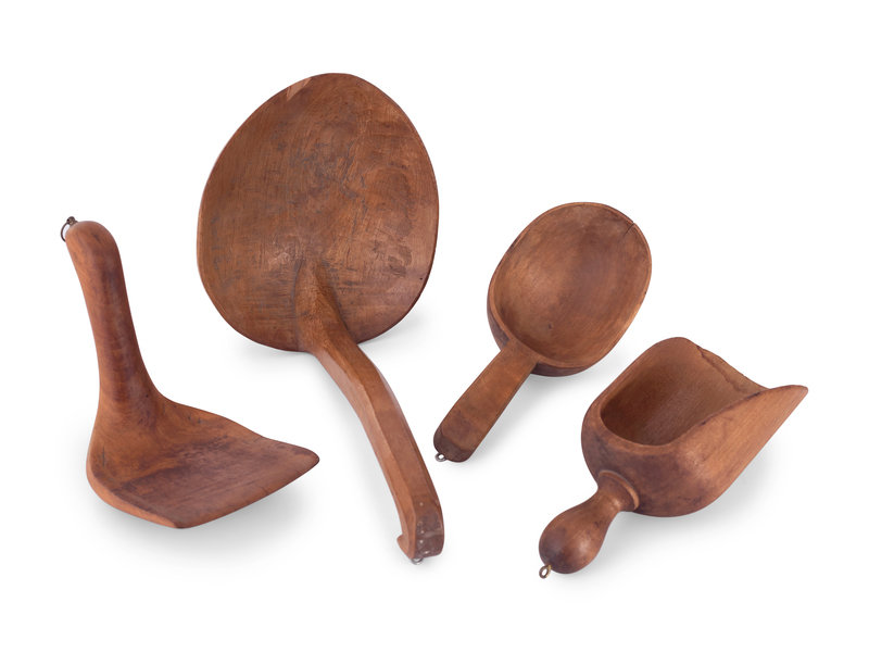 A Group of Wood Grain Scoops, Spoons and Other Utensils