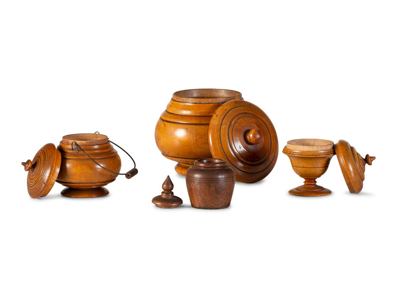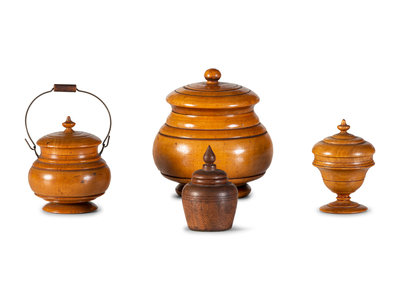 Four Diminutive Treenware Jars and Humidors