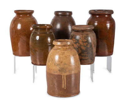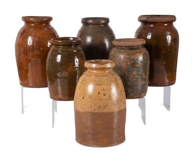 Six Galena Glaze Redware Crocks