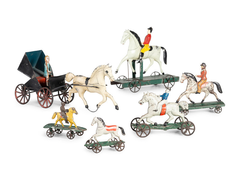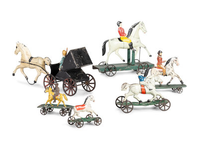 A Group of Six Pressed and Painted Tin Horse and Farm Animal Form Pull Toys