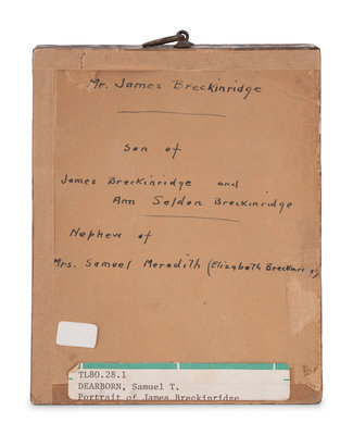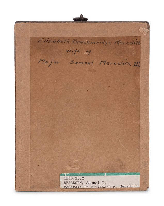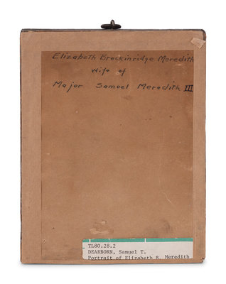 Elizabeth Meredith was born in 1766 and died in 1838. Her husband, Major Samuel Meredith III lived from 1765-1825. Both passed away in Fayette County, Kentucky. Elizabeth's brother James (1763-1833) and his wife, Ann Seldon (1770-1843), had seven children including a son, James, who lived from 1801 to 1823. There is no evidence that James lived outside of Virginia and in any case would have been younger than the sitter when this portrait was made. It is likely another member of the Meredith family. Elizabeth and Samuel's daughter, Letitia (1790-1868), and her husband Major William S. Dallam, are the subjects of another pair of portraits by Dearborn in MESDA's collection.