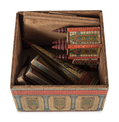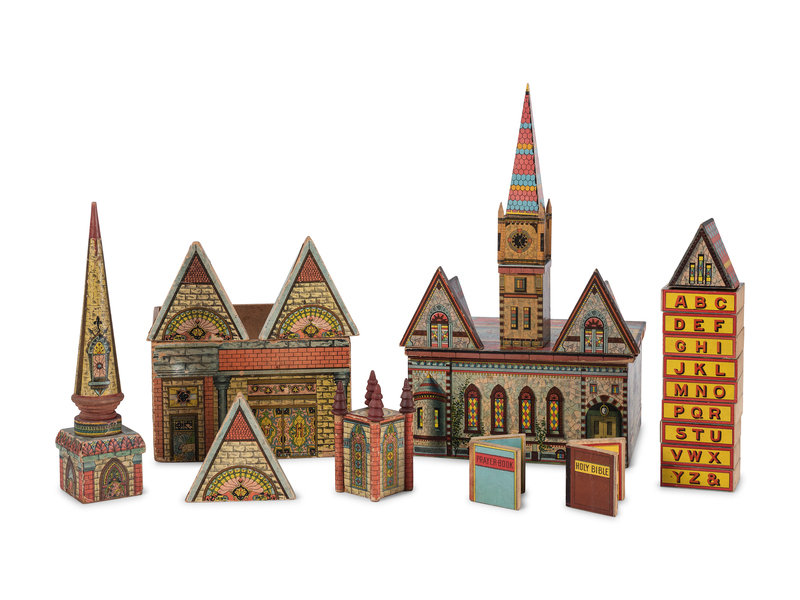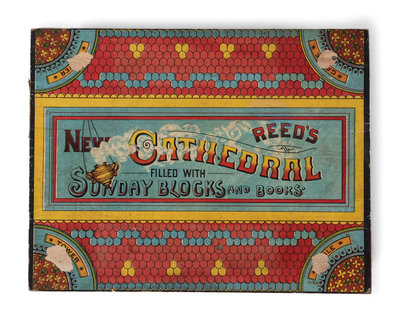 comprising an R. Bliss Mfg. Co. Church and Sunday School Blocks set including the box and ten building block components; and a Reed's New Cathedral Sunday Blocks and Books set including the box with lid, eleven building components, two wood block books and nine alphabet blocks.