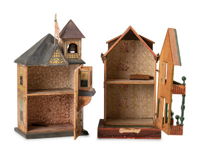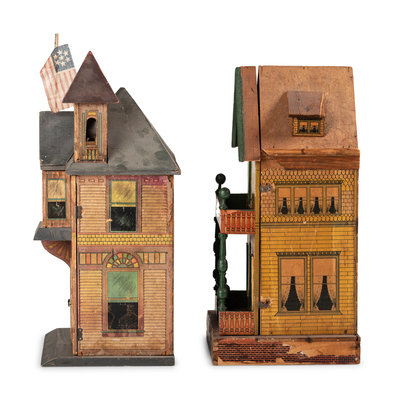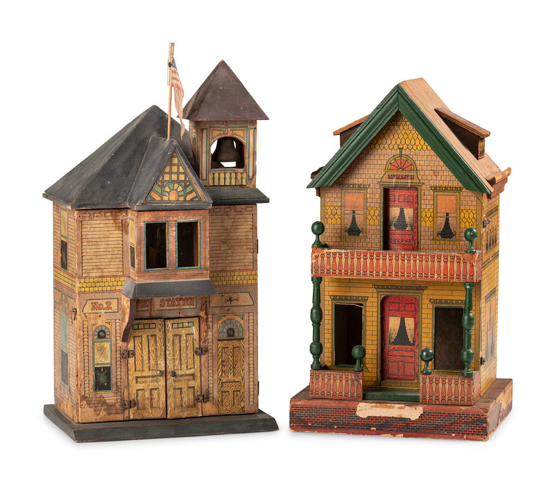 A Lithograph Paper on Wood Two-Story Doll House and Fire Station