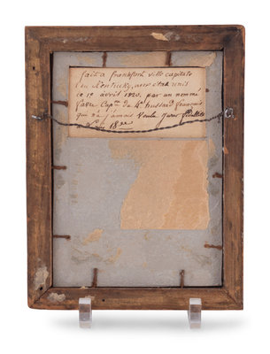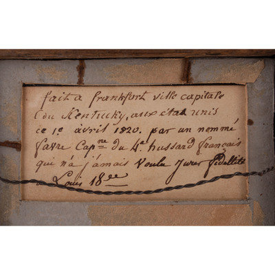 signed Favre pnxt, lower right and further inscribed in French on the reverse, "Made in the city of Frankfort, KY in the United States of America, April 1, 1820 by a man named Favre Captain in the 4th French Hussars who was never willing to swear loyalty to Louis 18th."