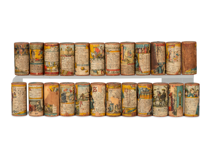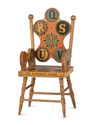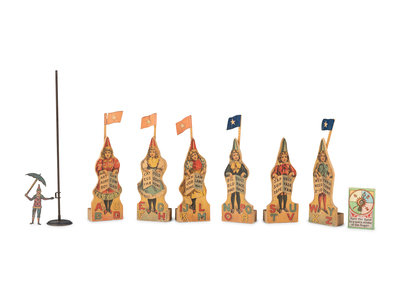 comprising thirteen Alphie's zoo animal alphabet blocks labeled Pat. Dec 5, 1916/ Copr. G.W.B. 19 to the top of each, by A. Schoenhut Company; six figural circus alphabet blocks; twenty-four cylindrical learning blocks; and a doll chair marked The Alphabet Chair and Patent Applied For on the seat; together with a tin clown pole toy and a paper spinner; 46 items total.