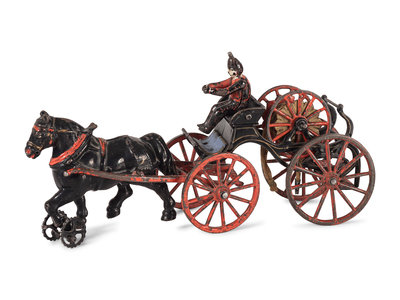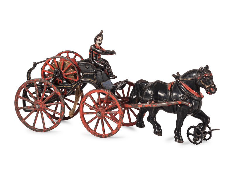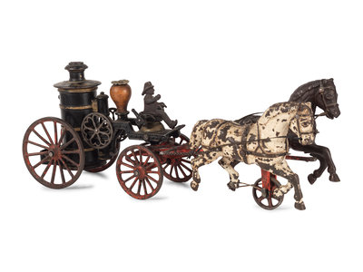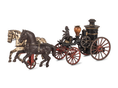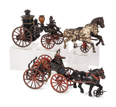 comprising a two-horse pumper wagon by Hubley and a single-horse fire hose wagon attributed to Ives.