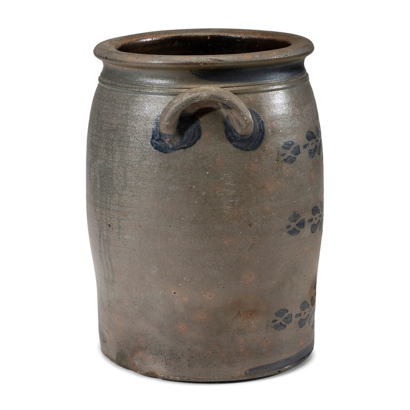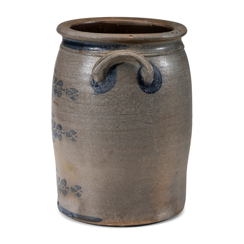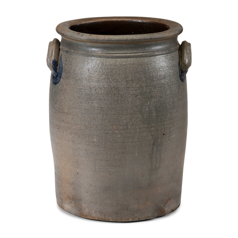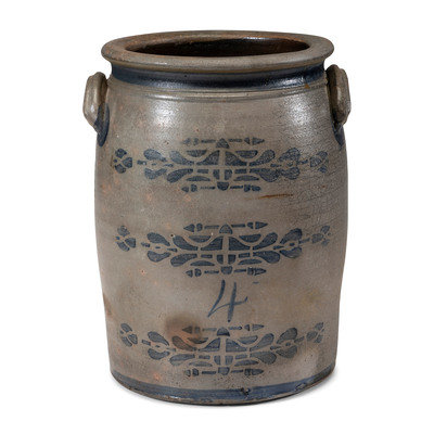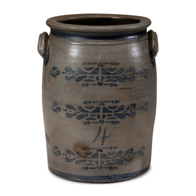 A Four-Gallon Cobalt and Stencil Decorated Stoneware Crock