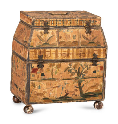 An English Silk and Metallic Thread Embroidered Jewelry Casket