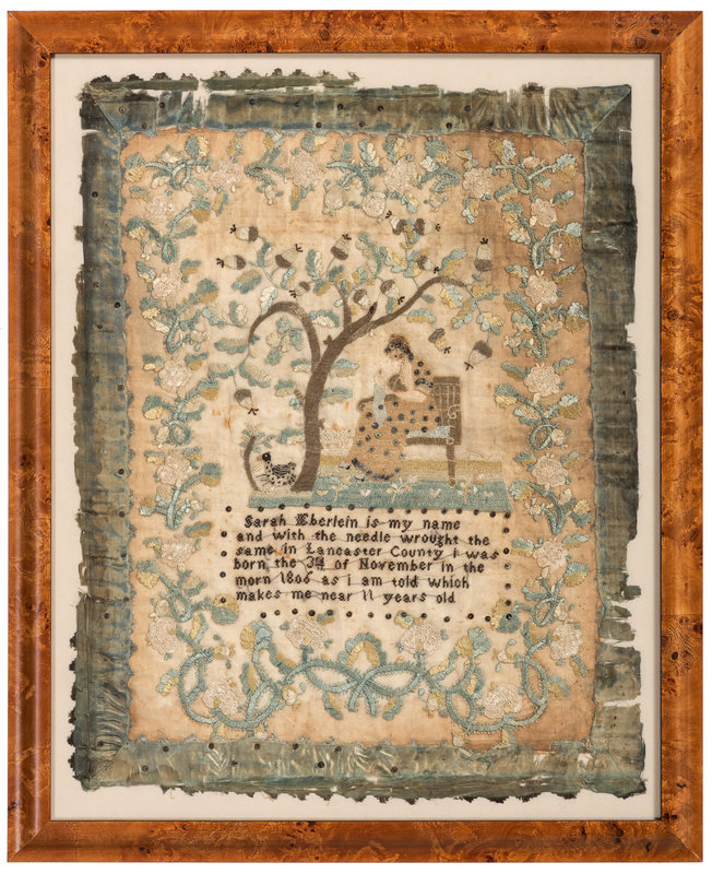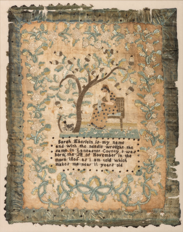 depicting a woman embroidering under a tree and within a floral border, reading Sarah Eberlein is my name / and with the needle wrought the / same in Lancaster County i was / born the 3rd of November in the / morn 1806 as i am told which / makes me near 11 years old.