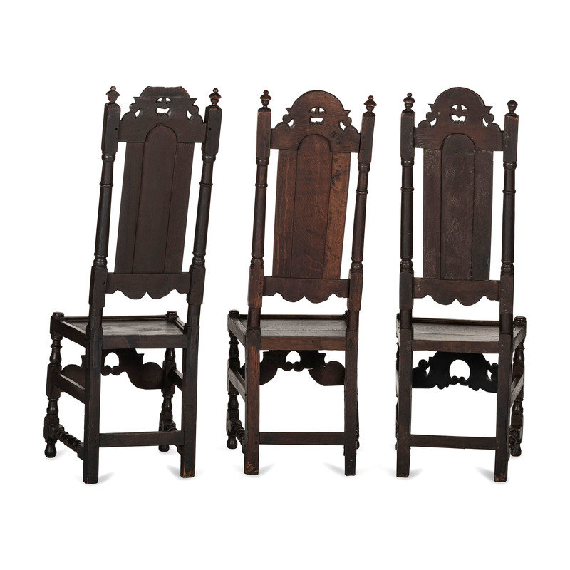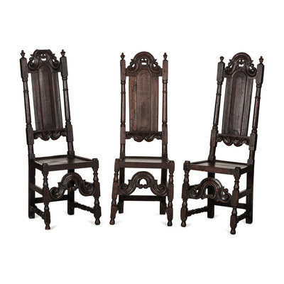 Three English Carved Oak Paneled Back Side Chairs