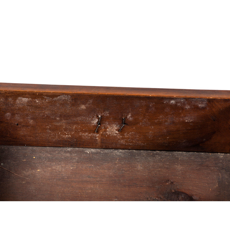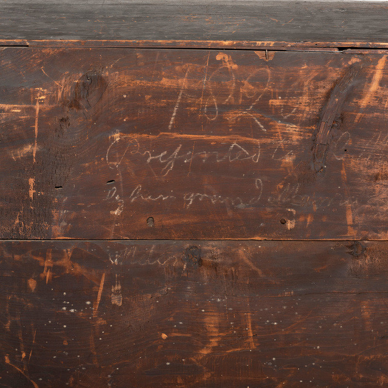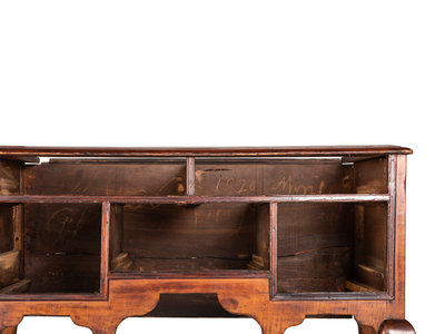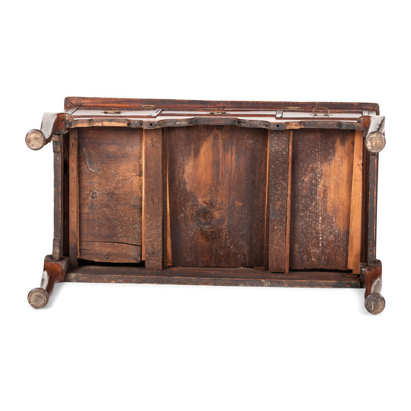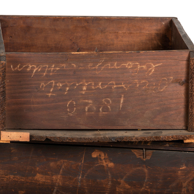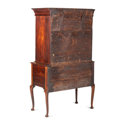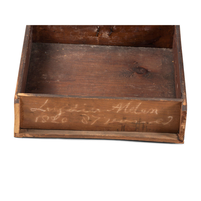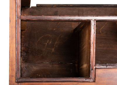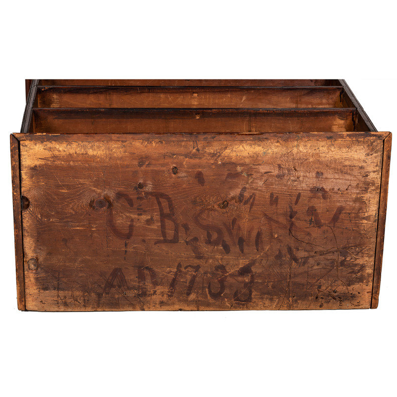 bearing chalk inscriptions to the back boards of the upper section: 1820 / Presented to … / by his Grand mama Lydia Melon (OR ALDEN?), the upper right drawer inscribed in chalk on the back board Lydia Melon 1820 Aged 87 years old, the underside of the top case is inscribed C.B. Swift AD 1733.