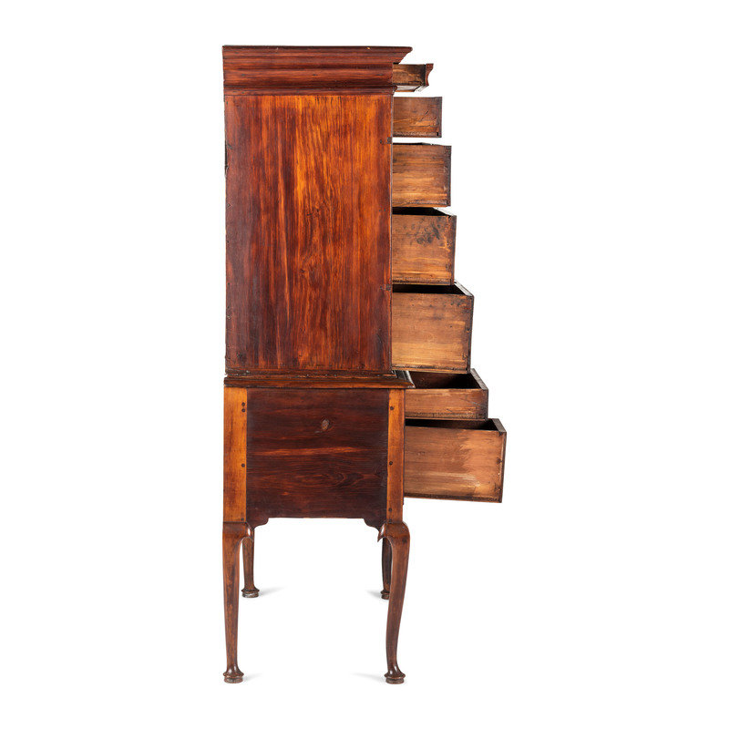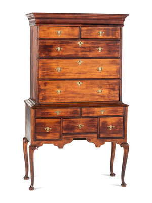 A Queen Anne Cherrywood and Maple Flat Top High Chest with Cornice Drawer
