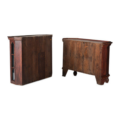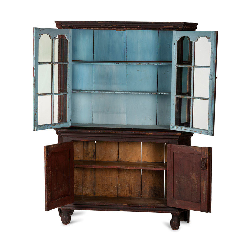 A Federal Red and Blue Painted Paneled Pine Cupboard
