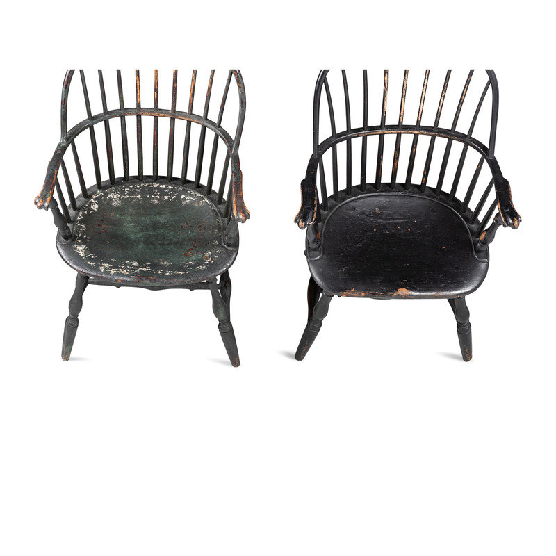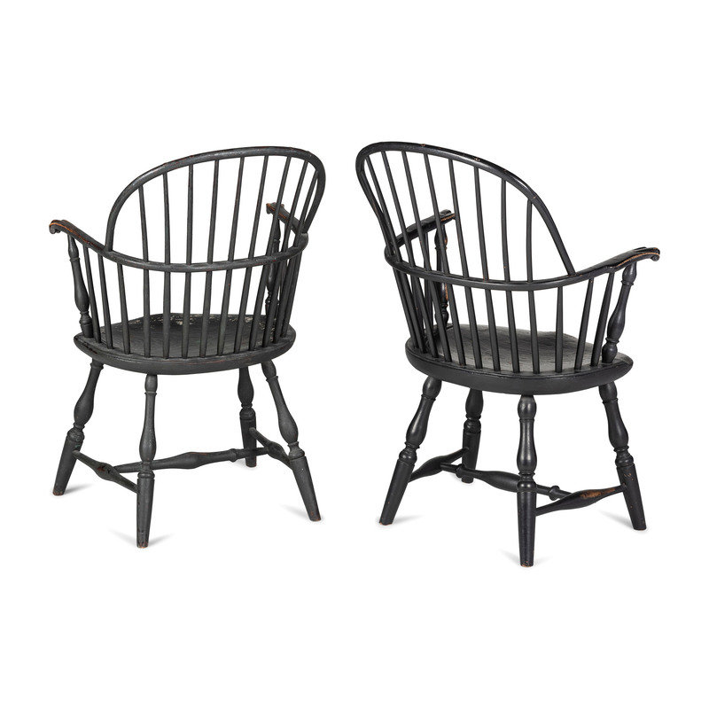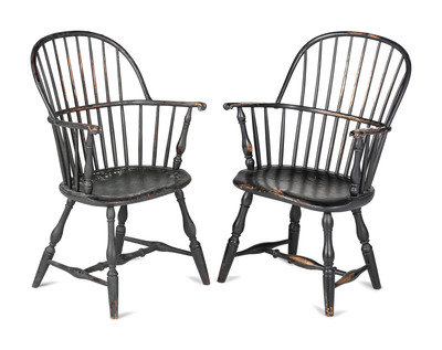 A Matched Pair of Paint Decorated Knuckle-Arm Sack Back Windsor Armchairs