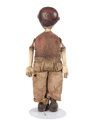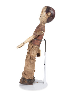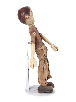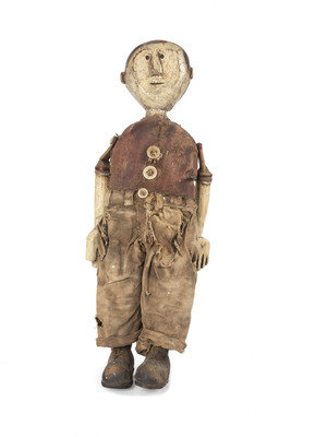 carved, painted and articulated wood with fabric clothing.