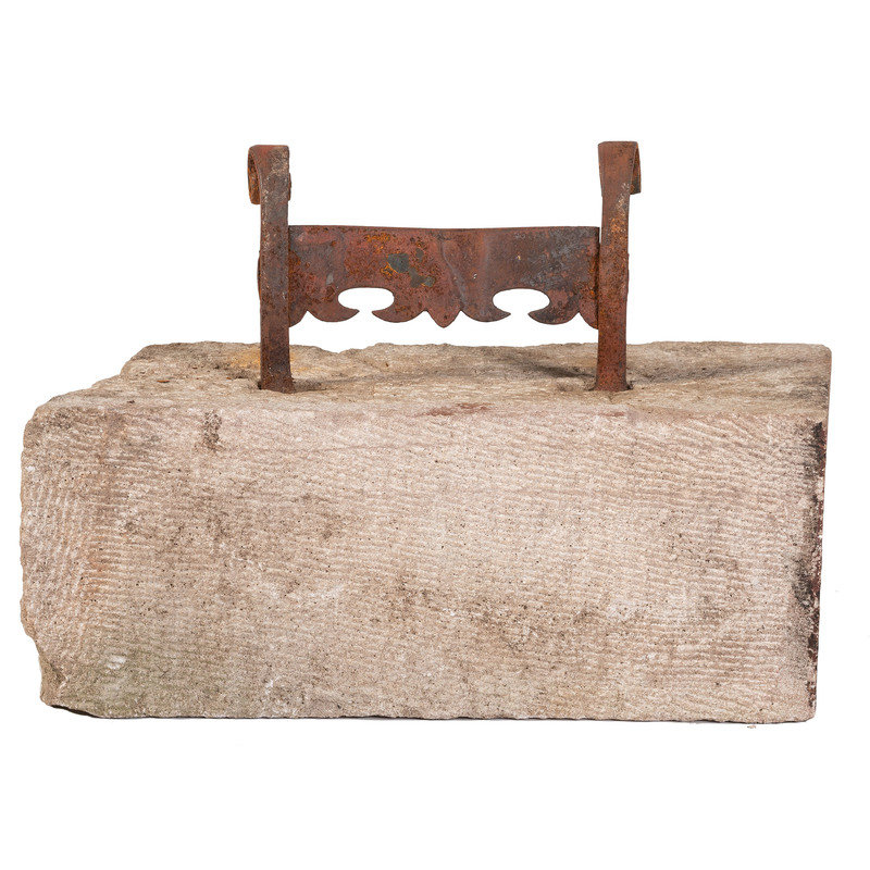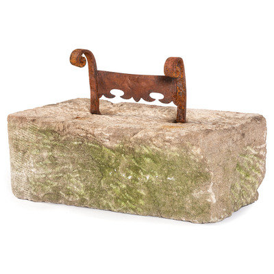 having a fancy detailed crossbar mortised into post and "ram's horn" terminations, set within a cut stone base.