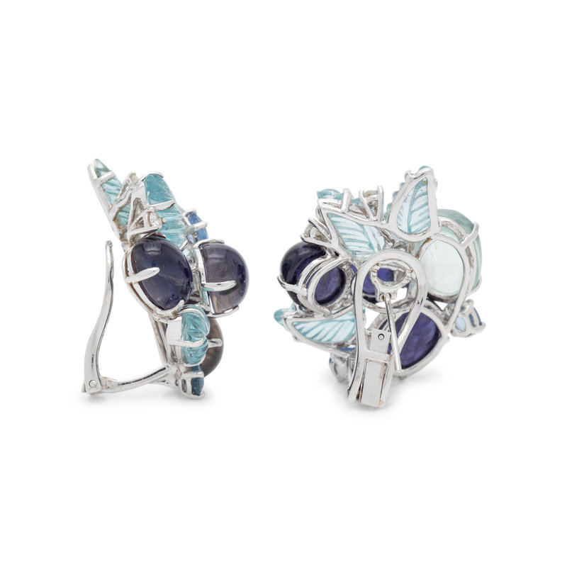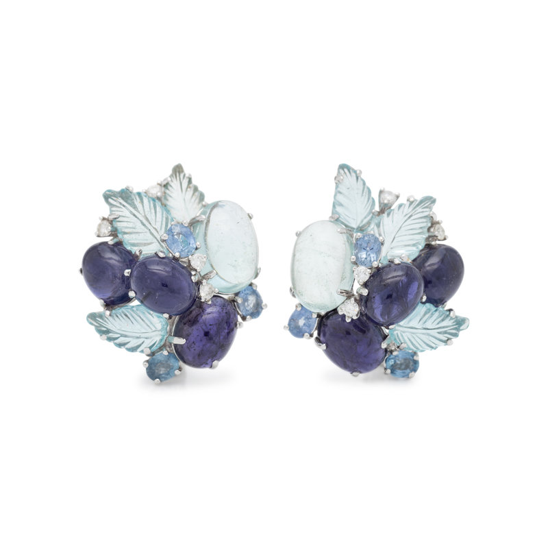Containing two oval cabochon, six oval mixed cut and six carved leaf aquamarines, six oval cabochon blue gemstones and eight round brilliant cut diamonds weighing approximately 0.30 carat total, folding posts with clip backs. Mounted in white gold. 1 1/4 inches long.
