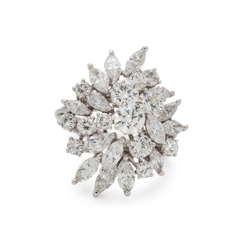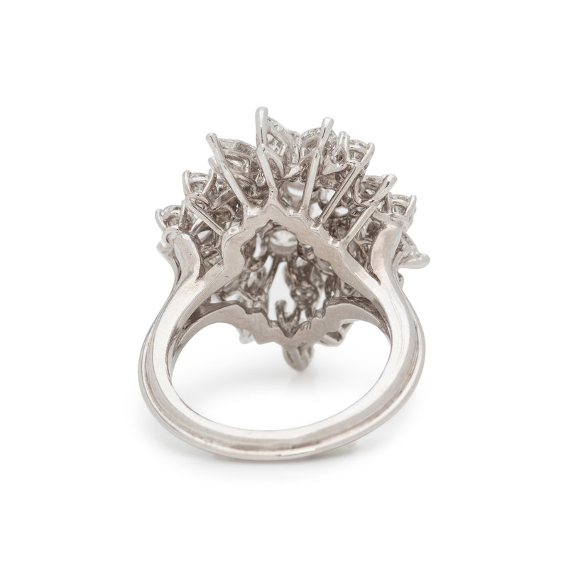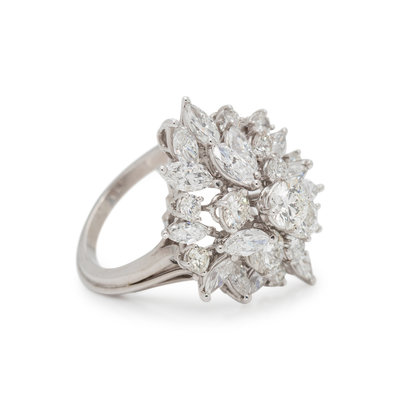 Containing 13 round brilliant and 15 marquise cut diamonds weighing approximately 2.90 carats total. Mounted in platinum. Ring size 5 3/4.
