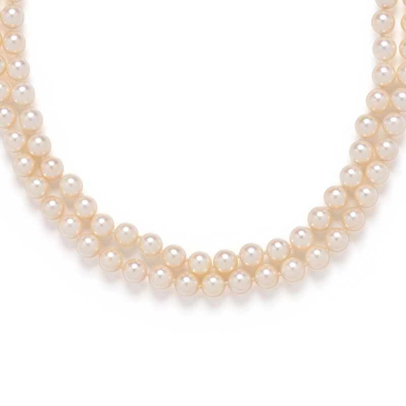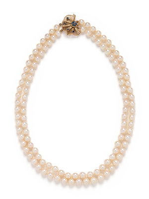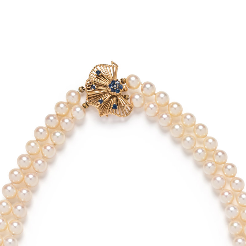 Consisting of two strands of pearls measuring approximately 7.00-7.45 mm in diameter, strung knotted with yellow gold clasp containing 11 round mixed cut sapphires. 18-20 inches long.