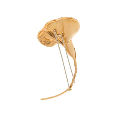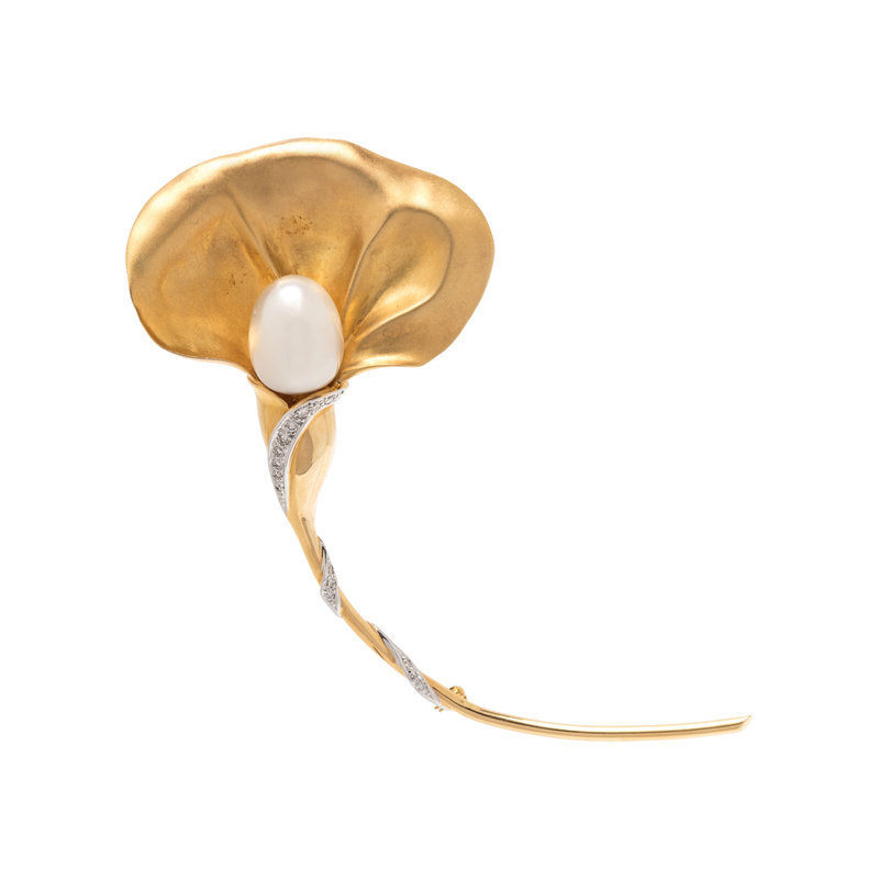 Consisting of a matte finish stylized lily containing one drop shaped pearl measuring approximately 15.80 x 12.60 mm and 16 round brilliant cut diamonds weighing approximately 0.25 carat total. 3 1/2 x 1 7/8 inches.