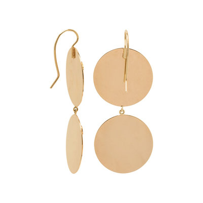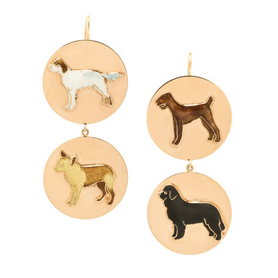 Consisting of disc drop earrings surmounted with enamel dogs of four different breeds. 2 3/8 inches long.