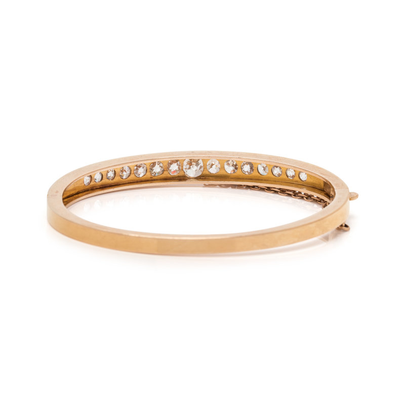 Containing 15 old mine cut diamonds weighing approximately 3.00 carats total, hinged with side clasp. 6 1/2 inches inner circumference.