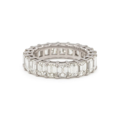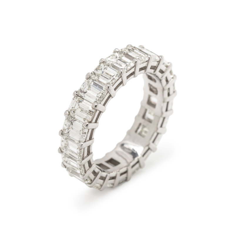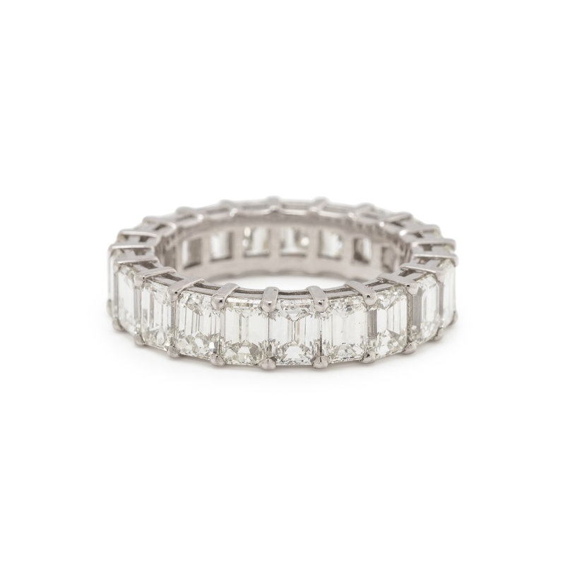 Containing 21 emerald cut diamonds weighing approximately 7.00 carats total. Mounted in platinum. Ring size 6.