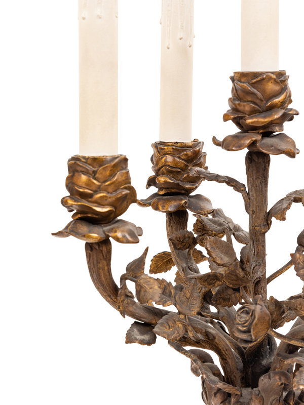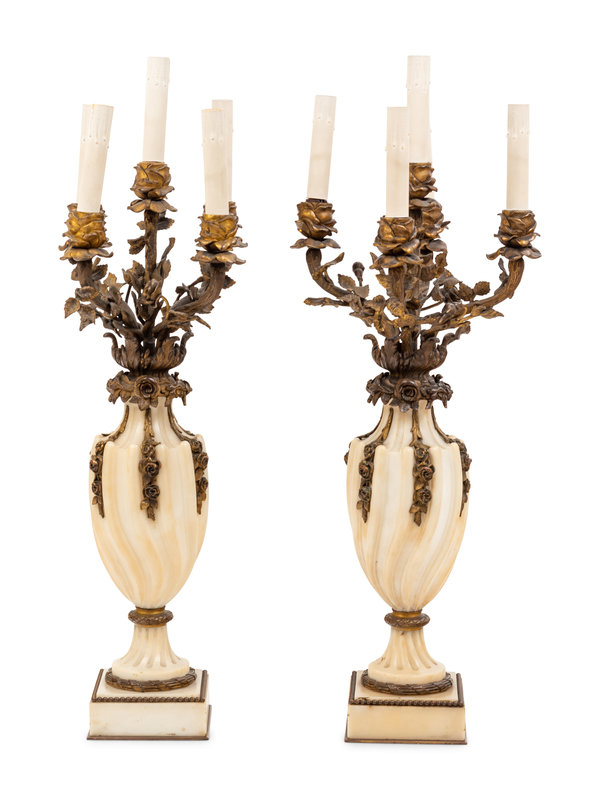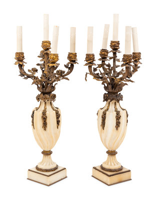 A Pair of French Bronze and Marble Urn-Form Five-Light Candelabra