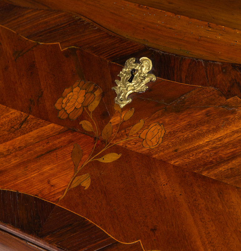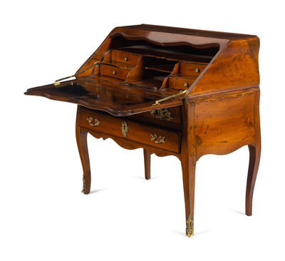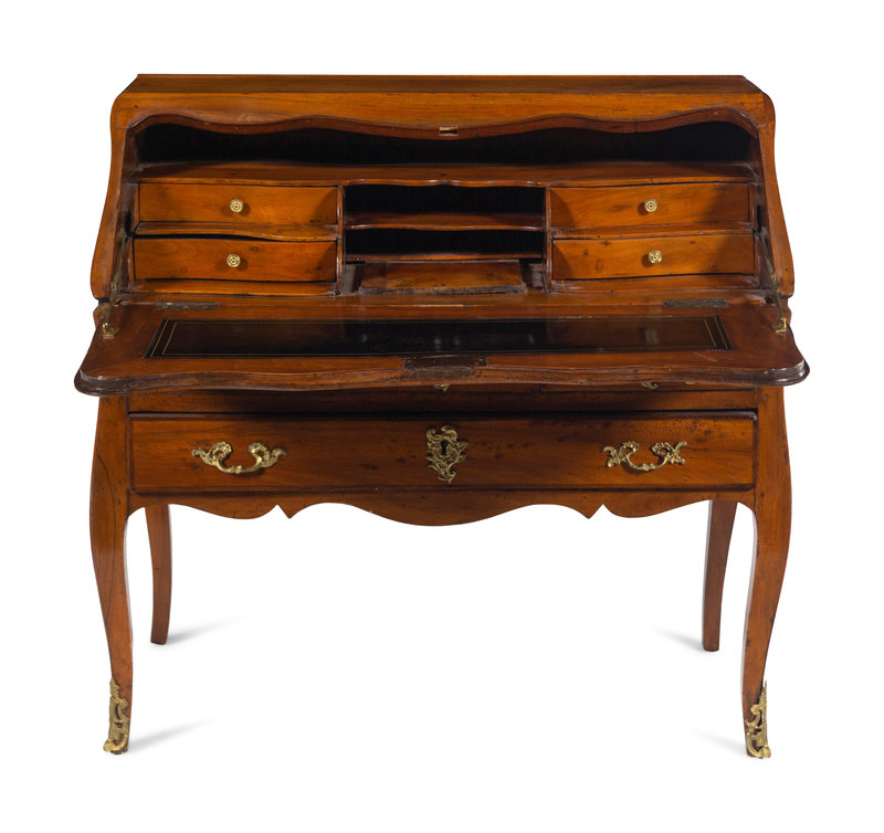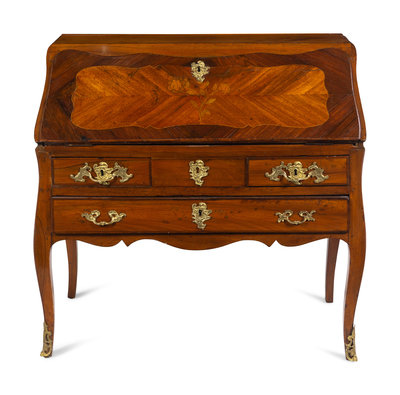 A Louis XV Gilt Bronze Mounted Walnut, Mahogany and Marquetry Bureau en Pente