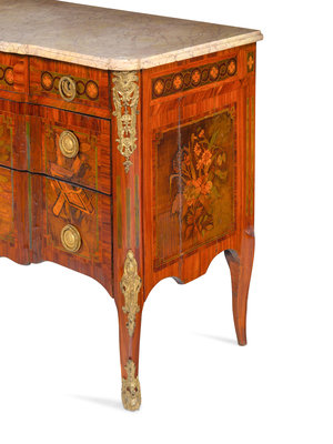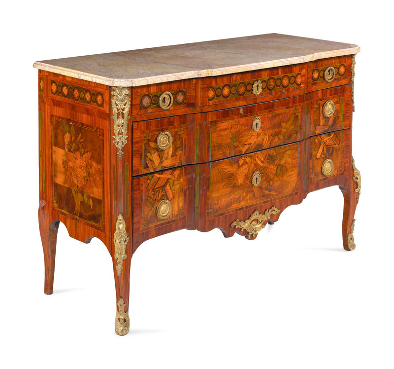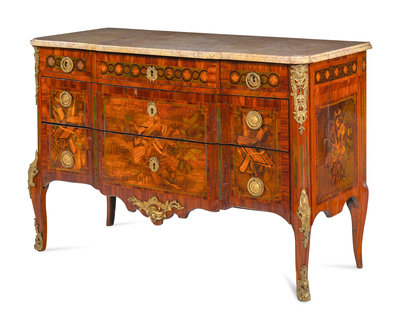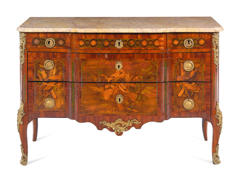 A Louis XV/XVI Transitional Style Gilt Metal Mounted and Sans Traverse Marquetry Marble-Top Commode