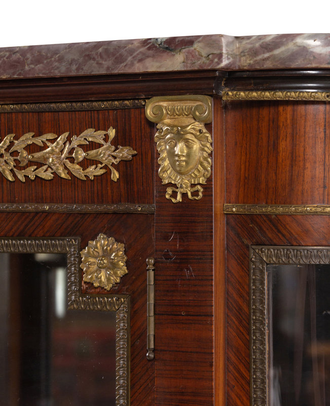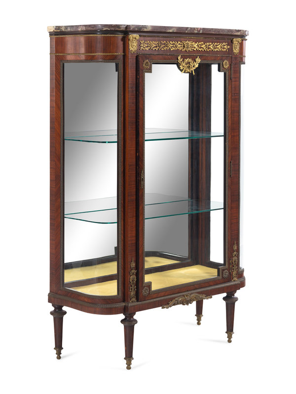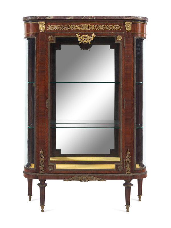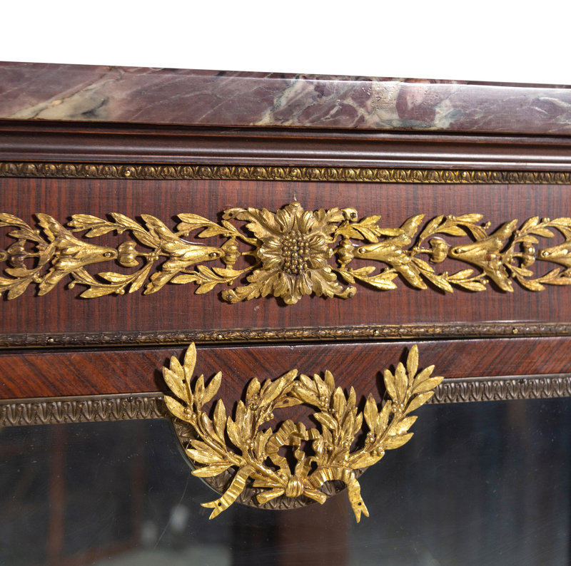 A Louis XVI Style Gilt Bronze Mounted Kingwood Veneered Marble-Top Vitrine Cabinet