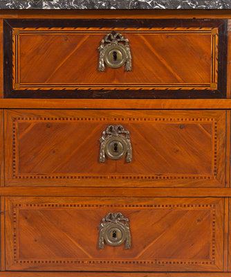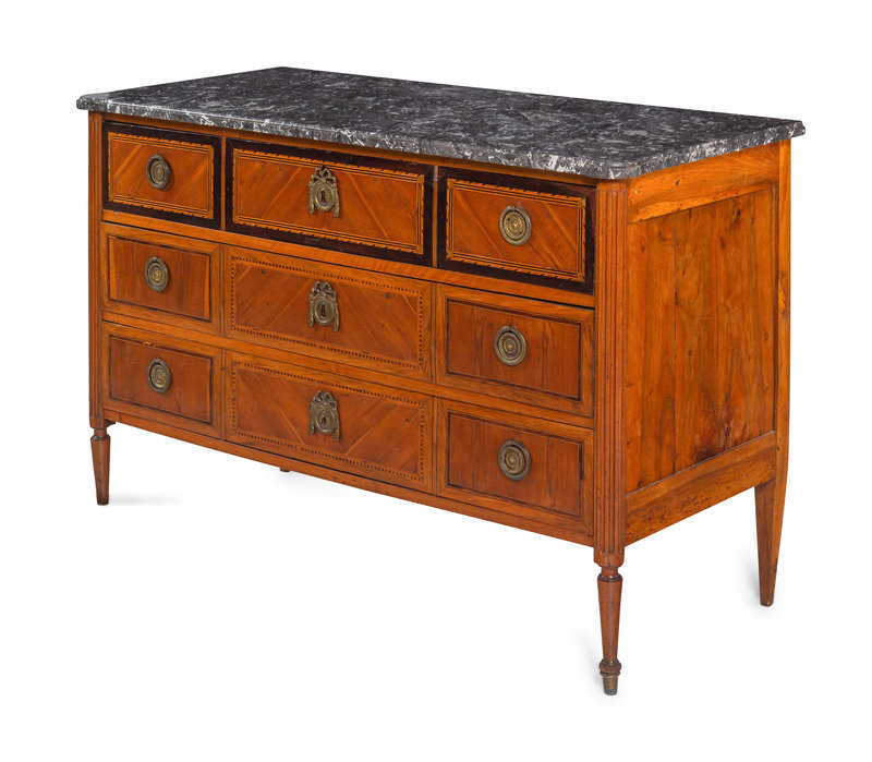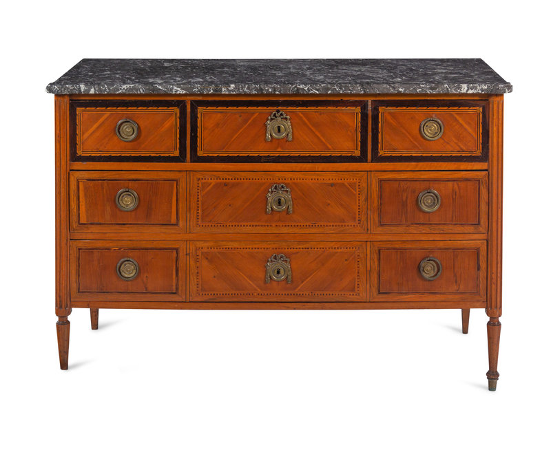 A Louis XVI Marquetry and Fruitwood Marble-Top Commode