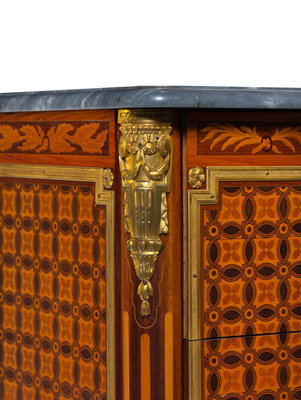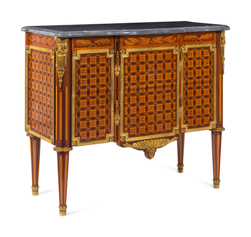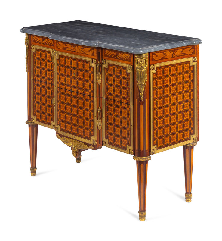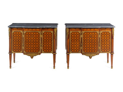 A Pair of Louis XVI Style Gilt Bronze Mounted Marquetry and Parquetry Marble-Top Commodes