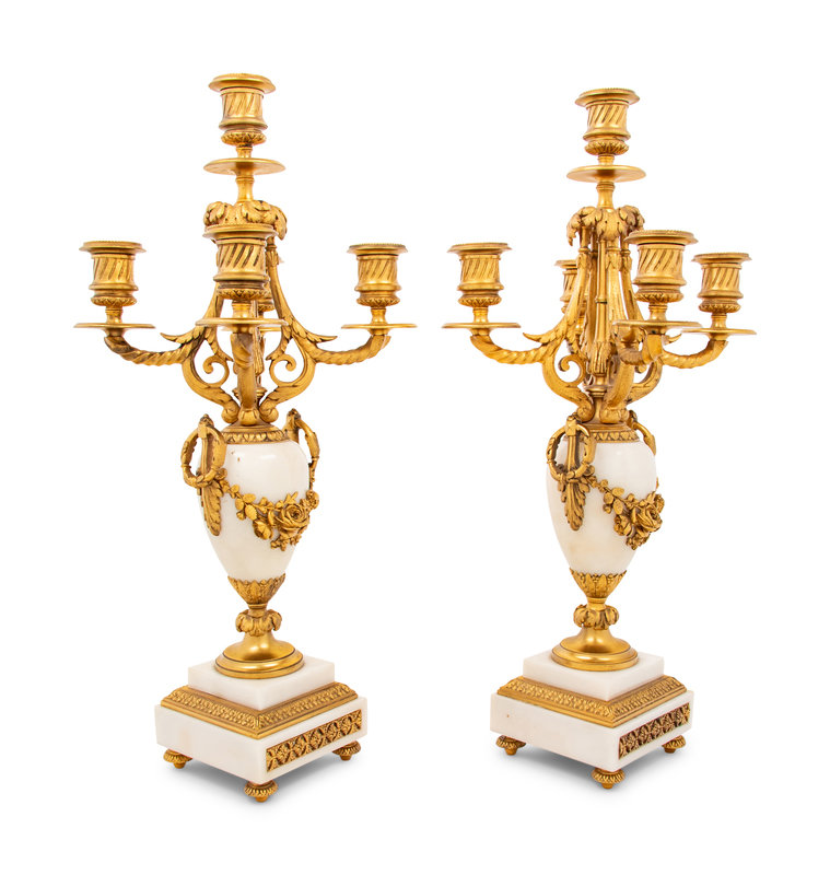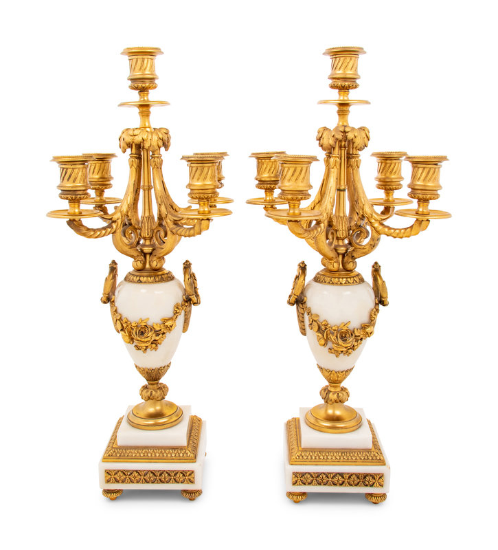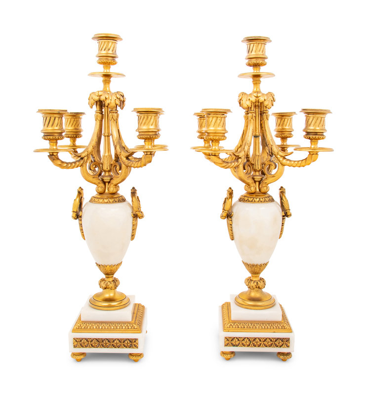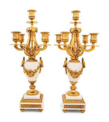 A Pair of Louis XVI Style Marble and Gilt Bronze Five-Light Candelabra