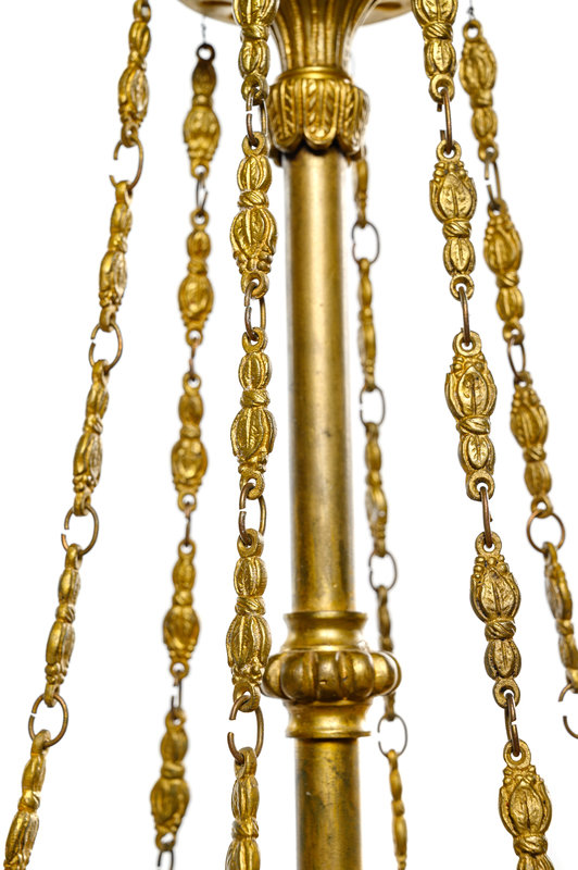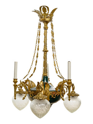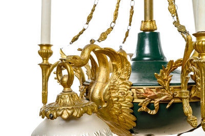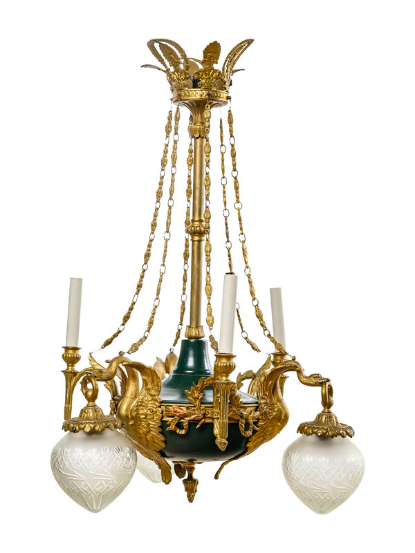 An Empire Style Gilt Bronze and Painted Tôle Six-Light Chandelier